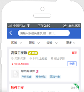- 海量工作機(jī)會等著您,同一時(shí)刻您將面對數(shù)以十萬的工作機(jī)會;幫助您記憶最近搜索條件,簡化您的搜索操作。